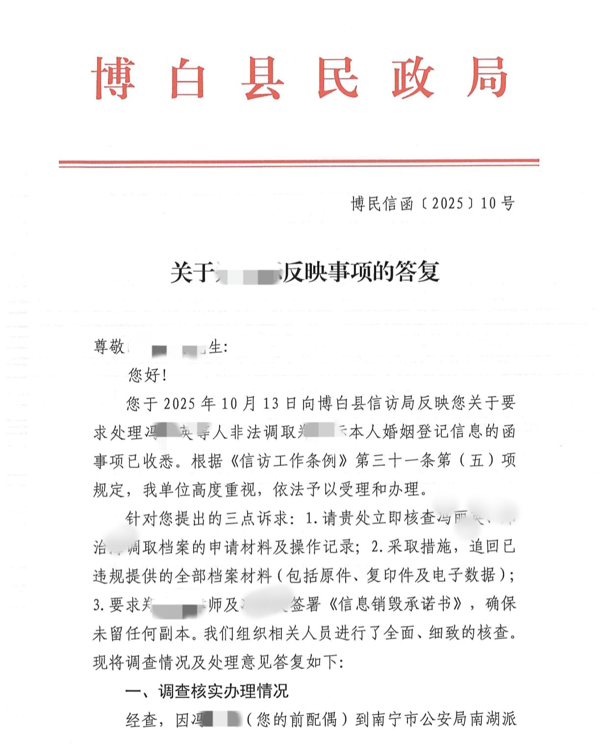 事件发生后,郑先生多次向相关部门投诉,提出核查调档材料及记录、追回违规提供的档案、要求相关方签署《信息销毁承诺书》三大核心诉求。2025年12月12日,博白县民政局出具回函,竟坚持此次调档“手续合规、配合公安、用途合理”,对郑先生的合理诉求百般推诿:称相关记录可查,但调档合法合规无权收回复印件;签署销毁承诺书属民事约定,超出行政职权范围,建议郑先生通过民事侵权诉讼维权。
