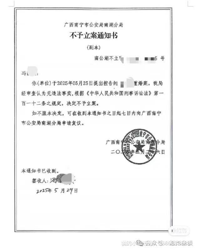 1996年,郑先生与冯某某在博白县民政局办理协议离婚,此后双方再无任何法律交集。2025年5月25日,冯某某以涉嫌重婚为由向南宁某派出所报案,警方经调查当日便出具《不予立案通知书》,彻底驳回其诉求。