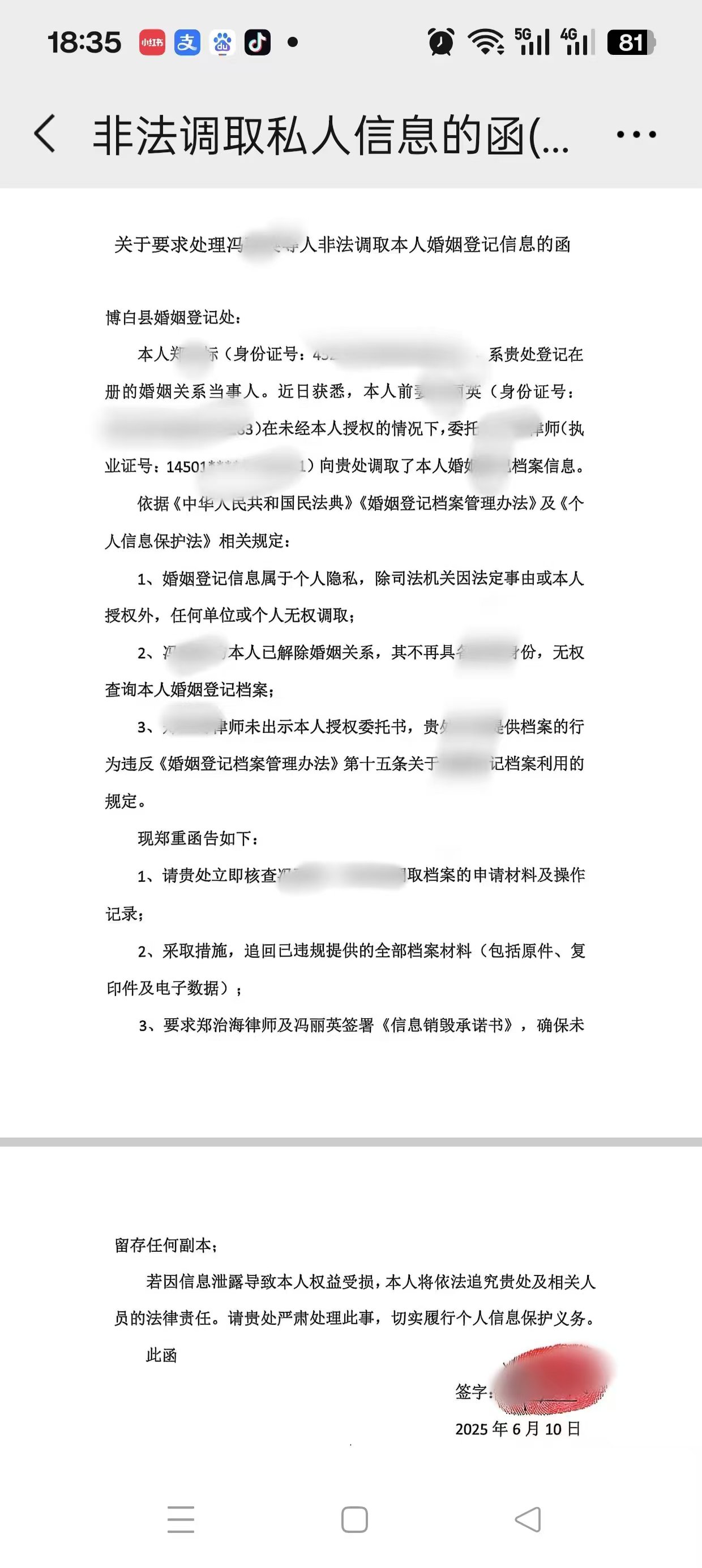 近日,广西玉林博白县市民郑先生的遭遇,撕开了基层婚姻档案管理与个人信息保护的致命漏洞:与前妻冯某某离婚29年后,其包含身份证号、住址等核心敏感信息的全部婚姻档案,竟被前妻委托的律师仅凭一份无法律效力的公安《受案回执》,从博白县民政局顺利调取。这些信息随即被用于恶意诬告,让郑先生陷入隐私遭践踏、名誉被诋毁的绝境。这起事件绝非简单的行政疏漏,而是博白县民政局无视法律刚性约束、肆意突破履职边界的严重失职,公然挑衅《个人信息保护法》《婚姻登记档案管理办法》权威,对公民个人信息安全的法律防线造成致命冲击。